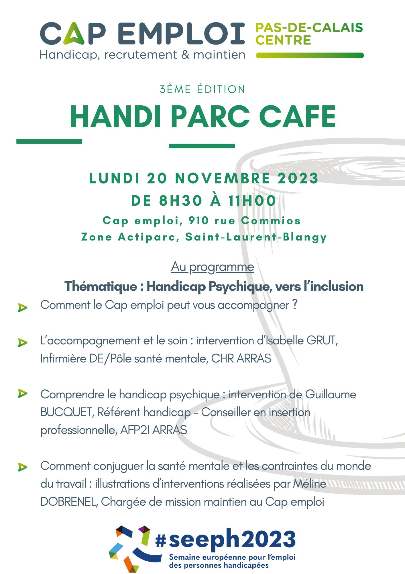 Dans le cadre de la Semaine Européenne pour l'Emploi des Personnes Handicapées, les Employeurs sont conviés au Handi Parc Café 2023.